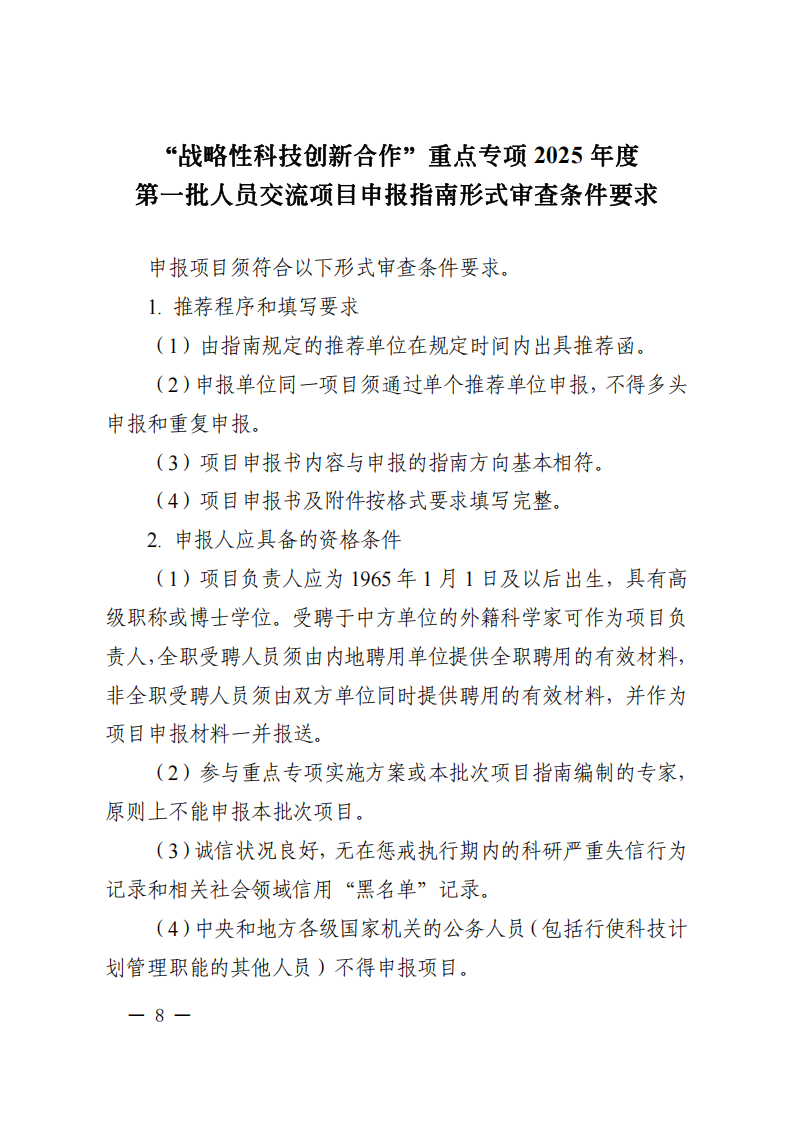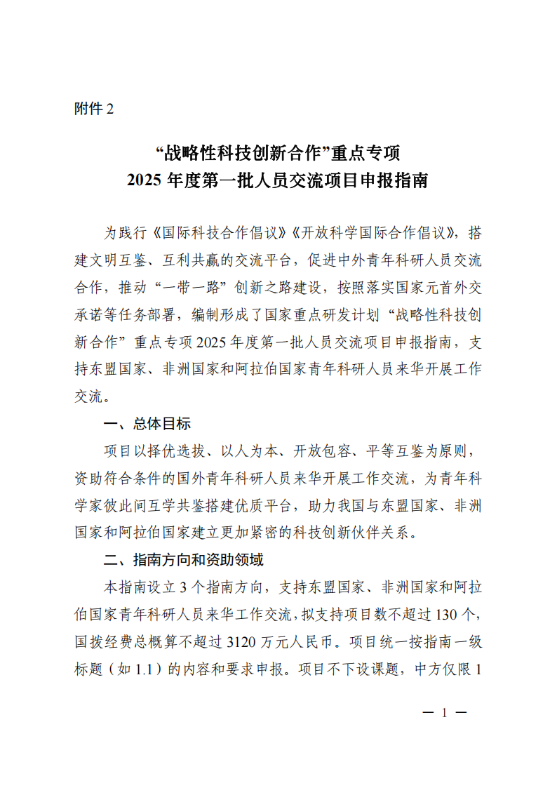 科技部國際合作司關于發(fā)布國家重點研發(fā)計劃“戰(zhàn)略性科技創(chuàng)新合作”重點專項2025年度第一批人員交流項目申報指南的通知