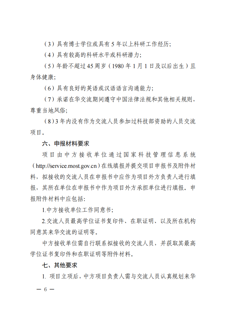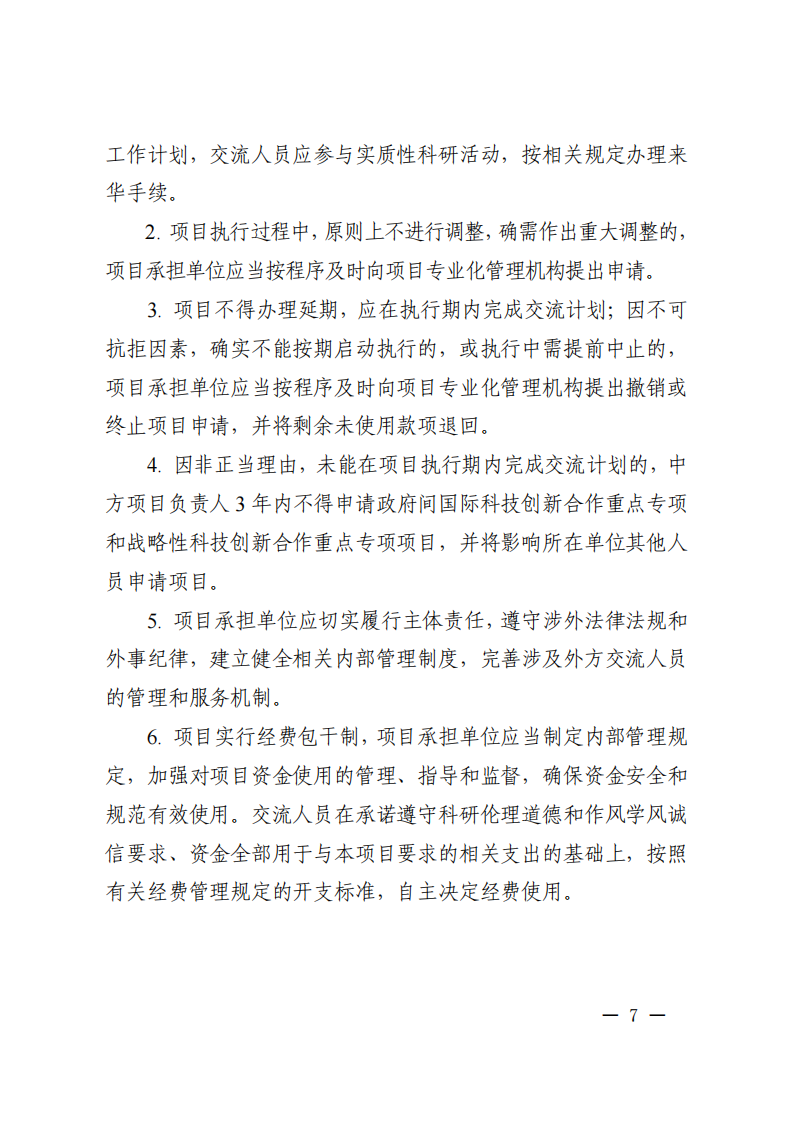 3. 本批次指南項目屬于“戰(zhàn)略性科技創(chuàng)新合作”重點專項人員交流類項目,不計入項目負責人申請和承擔國家重點研發(fā)計劃項目、國家科技重大專項(含科技創(chuàng)新2030—重大項目)的項目總數(shù)限項范圍(不進行項目負責人限項聯(lián)合審查),但項目負責人申請和在研的同一國別的人員交流類項目合計不得超過1項。
