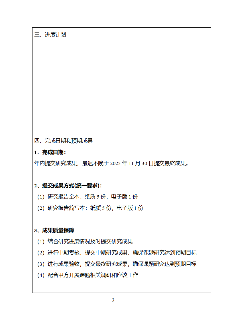 課題執行時間為簽訂合同之日起至2025年11月。課題承研單位應接受就業收入分配和消費司組織開展的課題中期評估和終期驗收,最遲不晚于11月30日提交課題最終研究成果(5份正式報告及報告簡本,1份電子文檔)。