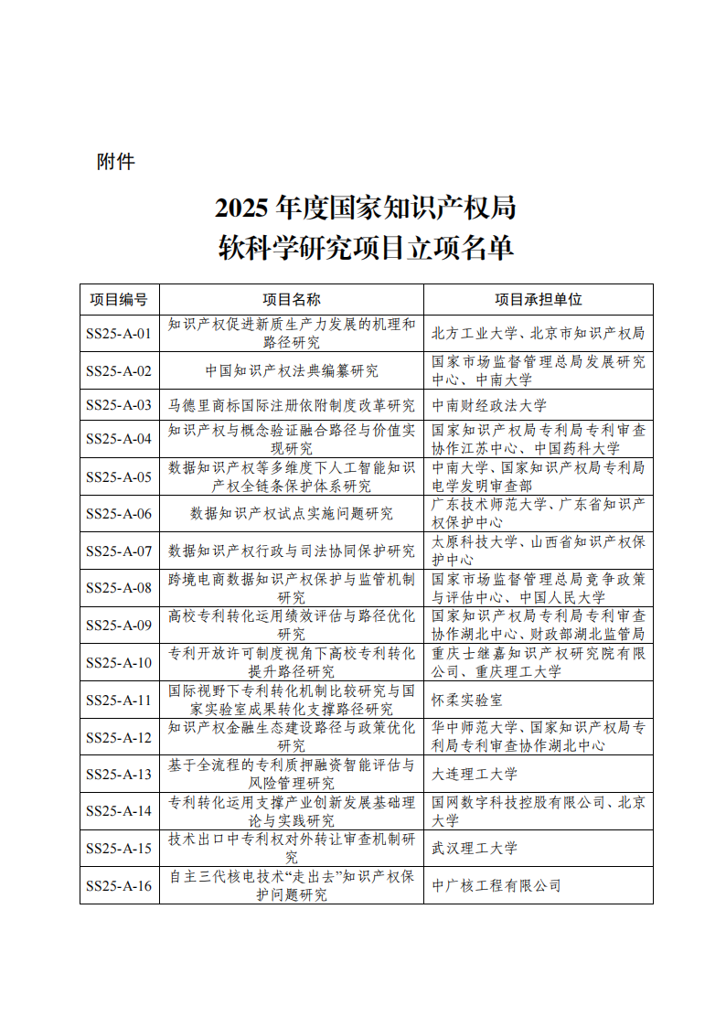 國家知識產權局辦公室關于印發2025年度軟科學研究項目立項名單的通知