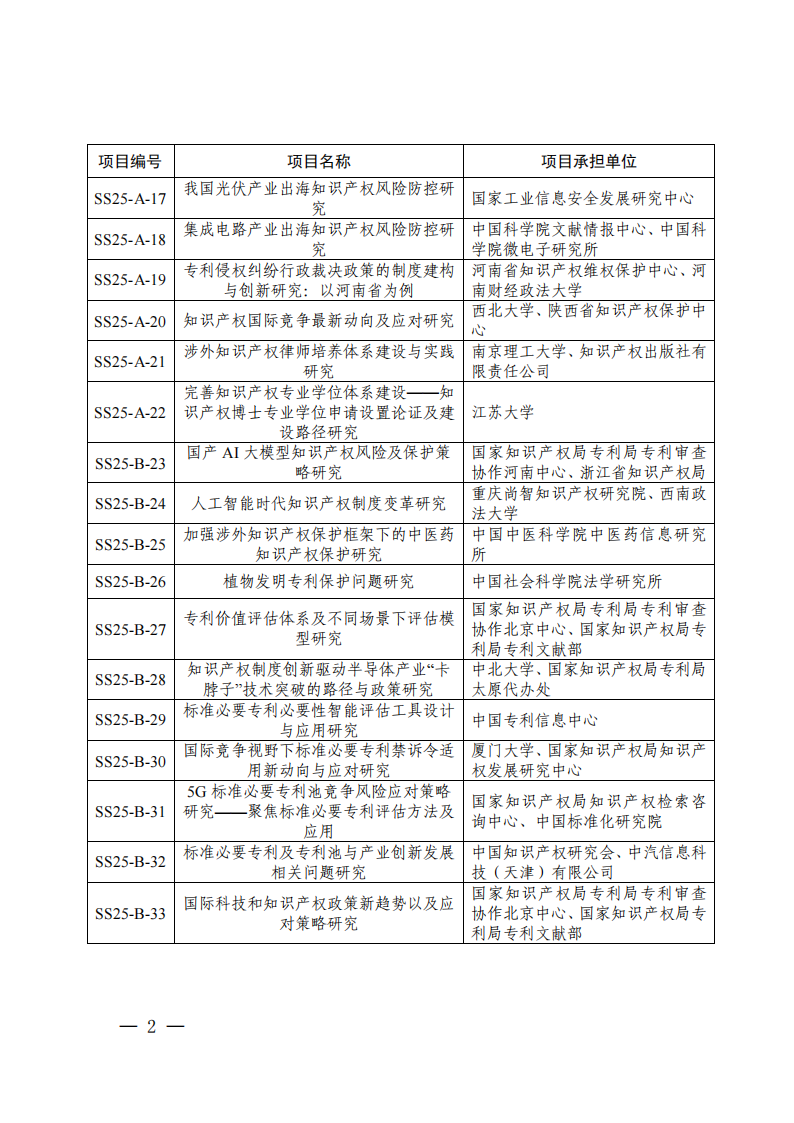 2025年度國家知識產權局軟科學研究項目立項評審工作已結束,現將立項名單印發。請項目承擔方按照項目管理方的相關要求,認真做好項目后續組織實施,按計劃開展研究工作,保證研究進度和質量。
