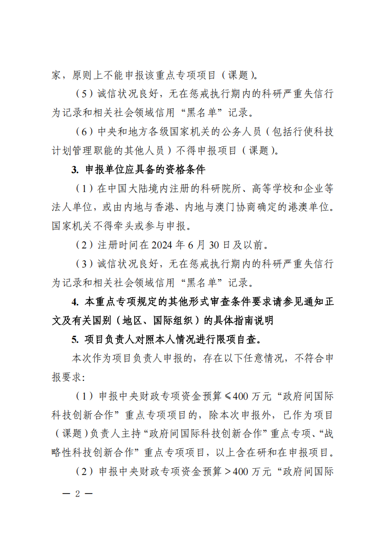 1.本批次指南項目屬于“政府間國際科技創新合作”重點專項聯合研發項目,本次申報的項目牽頭申報單位和參與單位應為中國大陸境內注冊的科研院所、高等學校和企業等(以下簡稱內地單位),或由內地與香港、內地與澳門協商確定的港澳單位(附件1)。