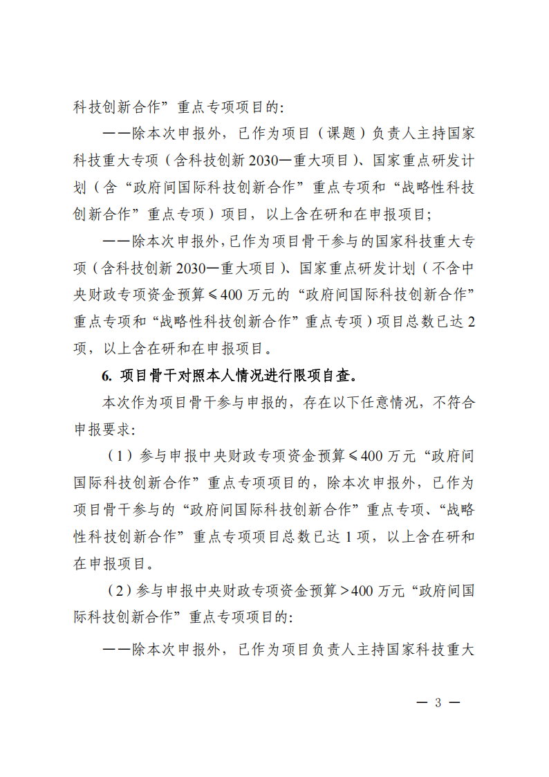 對于中央財政專項資金預算不超過400萬元的“政府間國際科技創新合作”重點專項(簡稱政府間專項)和“戰略性科技創新合作”重點專項(簡稱戰略性專項)項目,與國家重點研發計劃其他專項項目互不開展限項審查,對國家科技重大專項(含科技創新2030—重大項目)項目不開展限項審查;項目(課題)負責人的申報和在研的政府間專項和戰略性專項項目的總數限為1項(含不超過400萬元的項目);同時,項目骨干的申報和在研的政府間專項和戰略性專項項目的總數限為1項(含不超過400萬元的項目)。政府間專項和戰略性專項的人員交流項目不計入上述限項總數范圍。