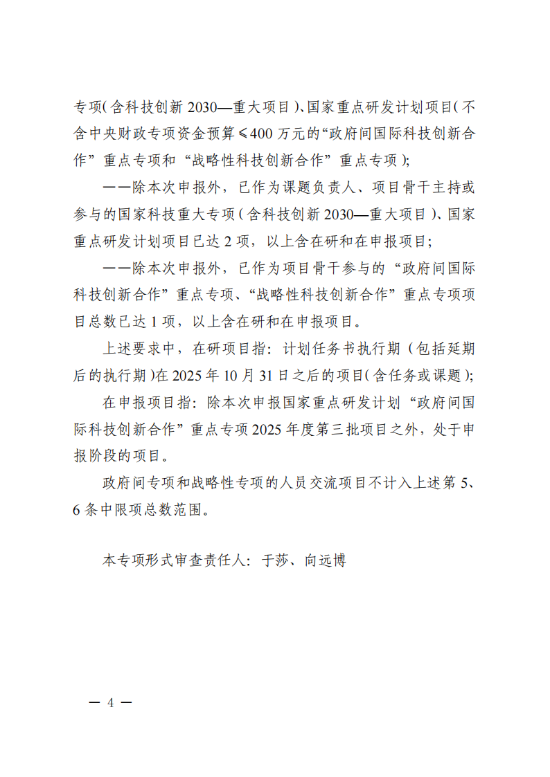 10. 中方申報單位務必與外方合作機構和人員明確以下幾項要求:外方項目牽頭人不得就同一研究方向和技術路線與國內不同單位合作多頭參與申報,其作為外方項目牽頭人申報項目和參與在研項目總數不得超過2個。已受聘于中方科研單位并參與國家重點研發計劃、國家科技重大專項(含科技創新2030—重大項目)在研項目(課題)的科研人員,不得再作為外方人員參與申報。