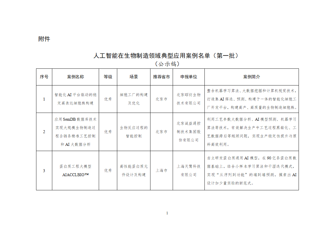 人工智能在生物制造領域典型應用案例名單(第一批)公示