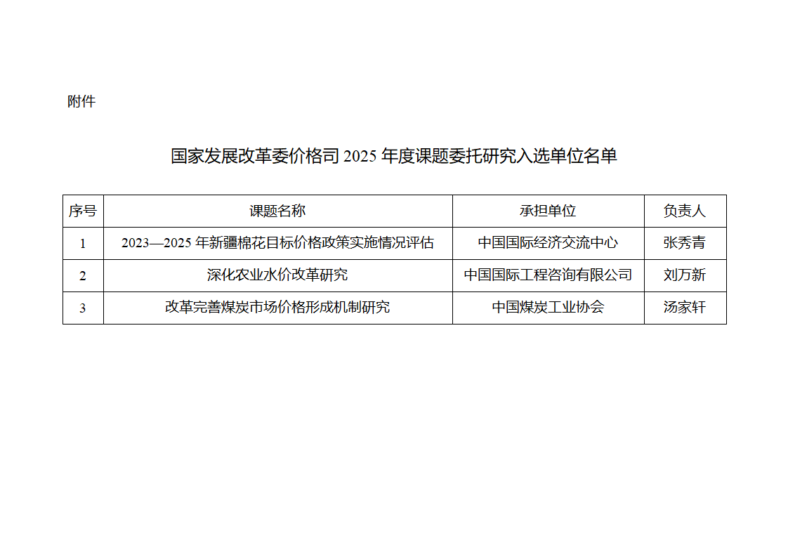 附件:國家發(fā)展改革委價(jià)格司2025年度課題委托研究入選單位名單