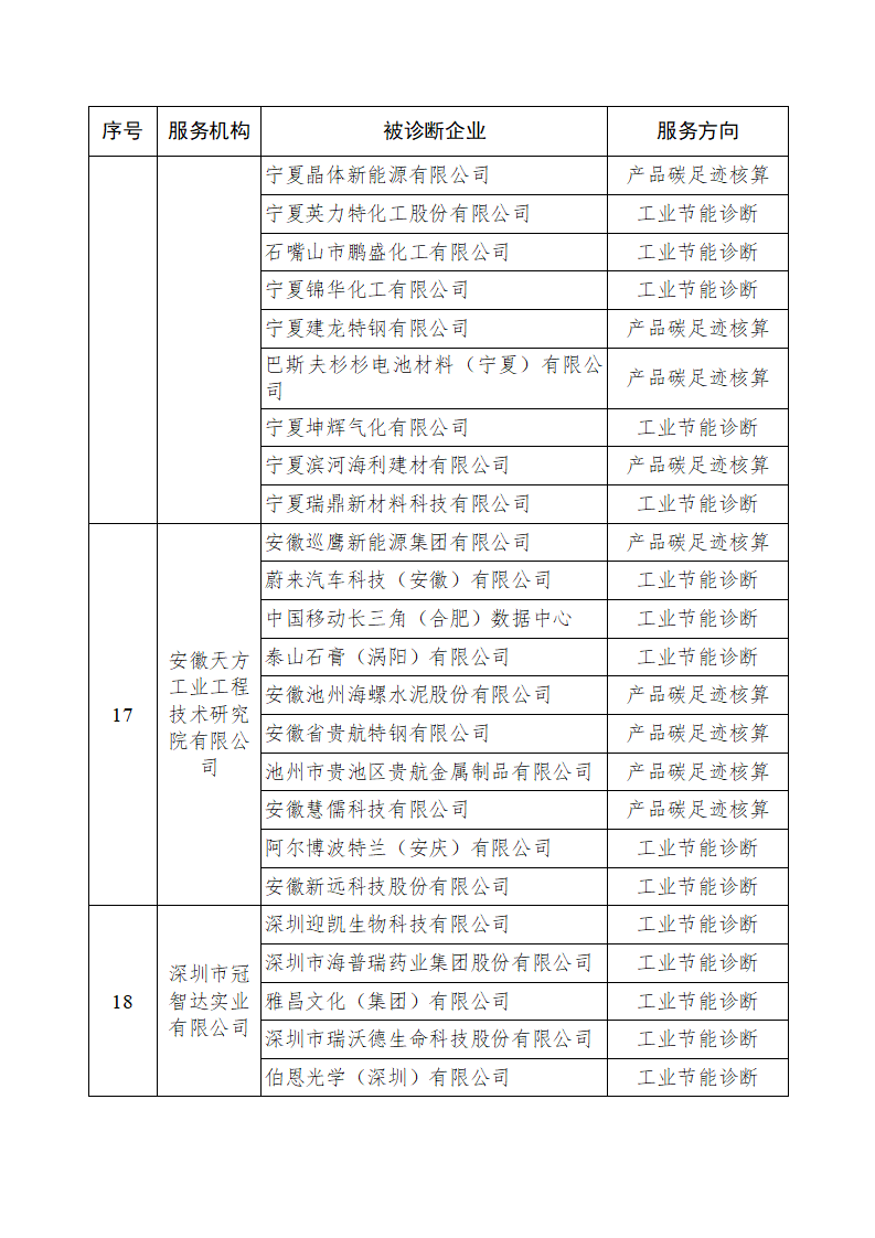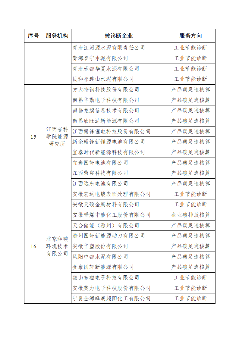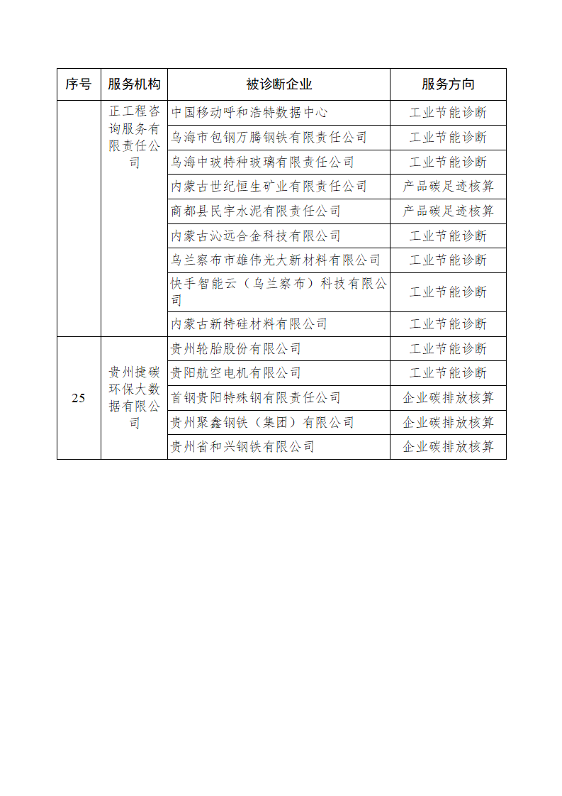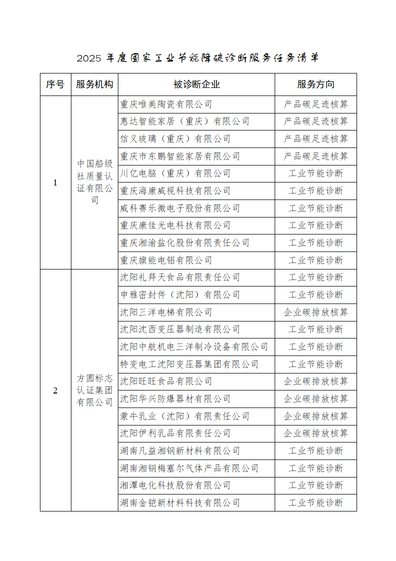 按照《工業和信息化部辦公廳關于組織開展2025年度工業節能降碳診斷服務工作的通知》(工信廳節函〔2025〕115號,以下簡稱《通知》),經省級工業和信息化主管部門、中央企業集團推薦,公開招標等程序,確定25家中標機構為307家工業企業提供節能診斷、產品碳足跡核算、企業碳排放核算等服務。現將任務清單印發給你們,請按照《通知》要求,落實好年度工業節能降碳診斷服務任務。