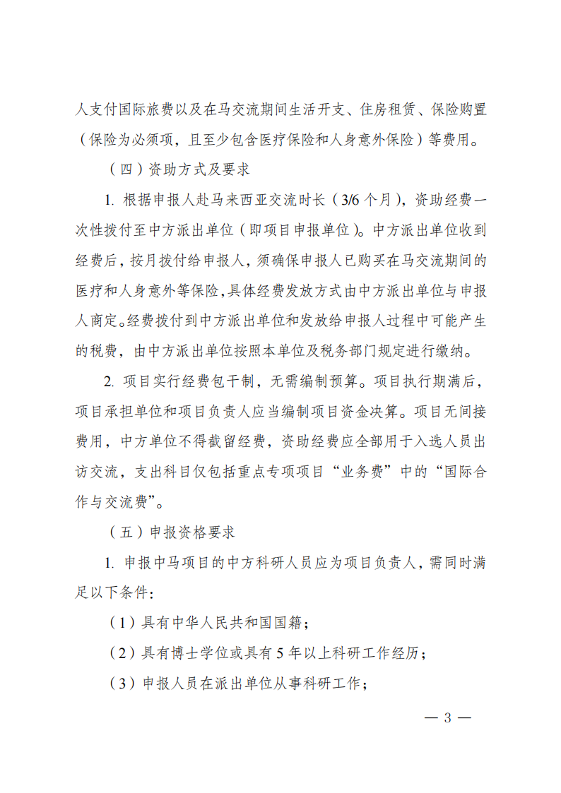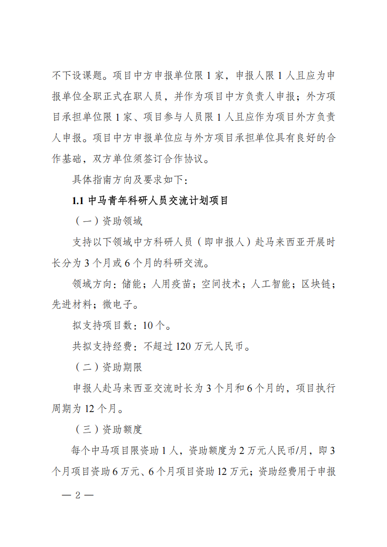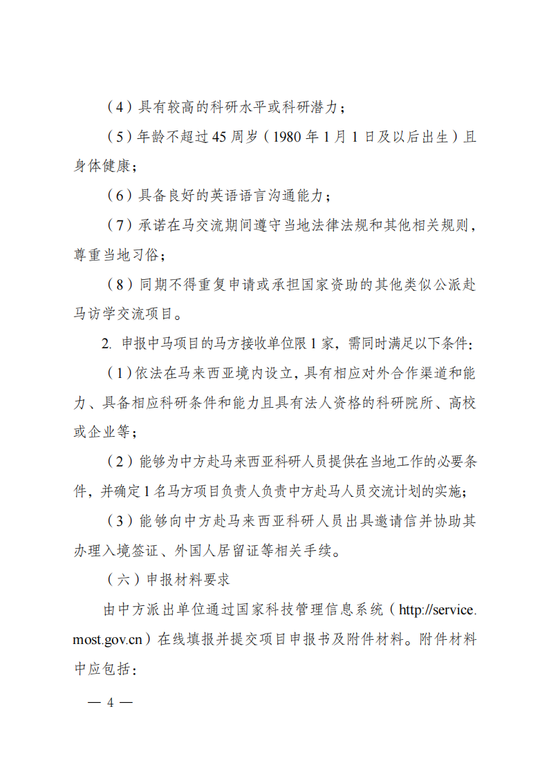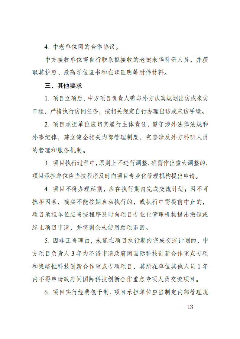 3. 本批次指南項目屬于“政府間國際科技創(chuàng)新合作”重點專項人員交流類項目,不計入項目負責人申請和承擔國家重點研發(fā)計劃項目、國家科技重大專項(含科技創(chuàng)新2030—重大項目)的項目總數(shù)限項范圍(不進行項目負責人限項聯(lián)合審查),但項目負責人申請和在研的同一國別的人員交流類項目合計不得超過1項。