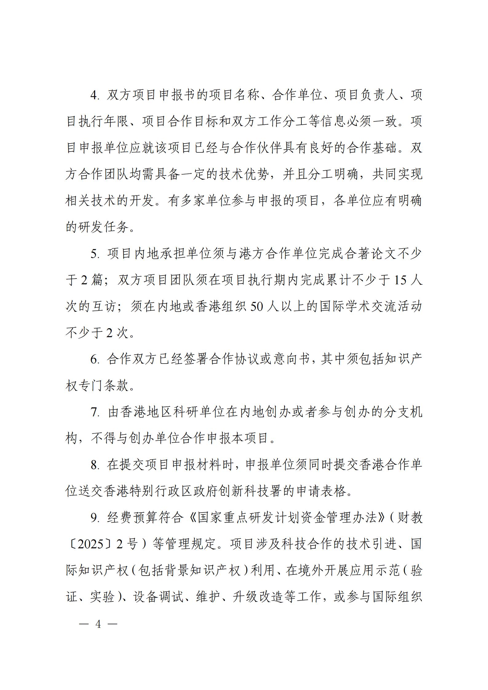 9. 內地單位務必與香港合作機構和人員明確以下幾項要求:香港項目牽頭人不得就同一研究方向和技術路線與內地不同單位合作多頭參與申報,其作為項目牽頭人申報項目和參與在研項目總數不得超過2個。已作為受聘于內地的外籍及港、澳、臺地區科學家參與國家重點研發計劃、科技創新2030—重大項目在研項目(課題)的,不得再作為港方人員參與申報。