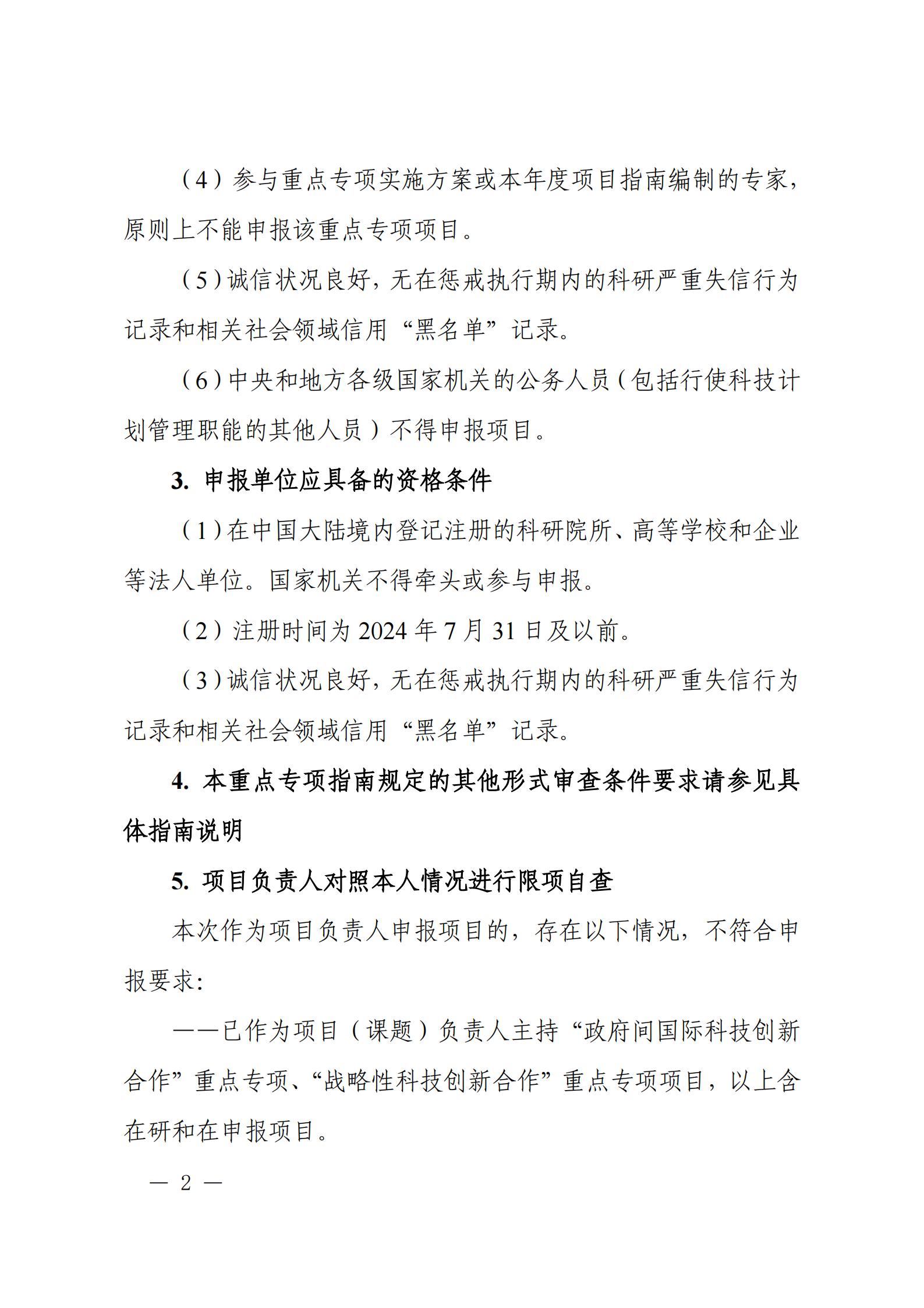 1. 申報本次“戰略性科技創新合作”重點專項的項目牽頭申報單位和參與單位應為中國大陸境內注冊的科研院所、高等學校和企業等,且應具有獨立法人資格,單位注冊時間為2024年7月31日及以前。