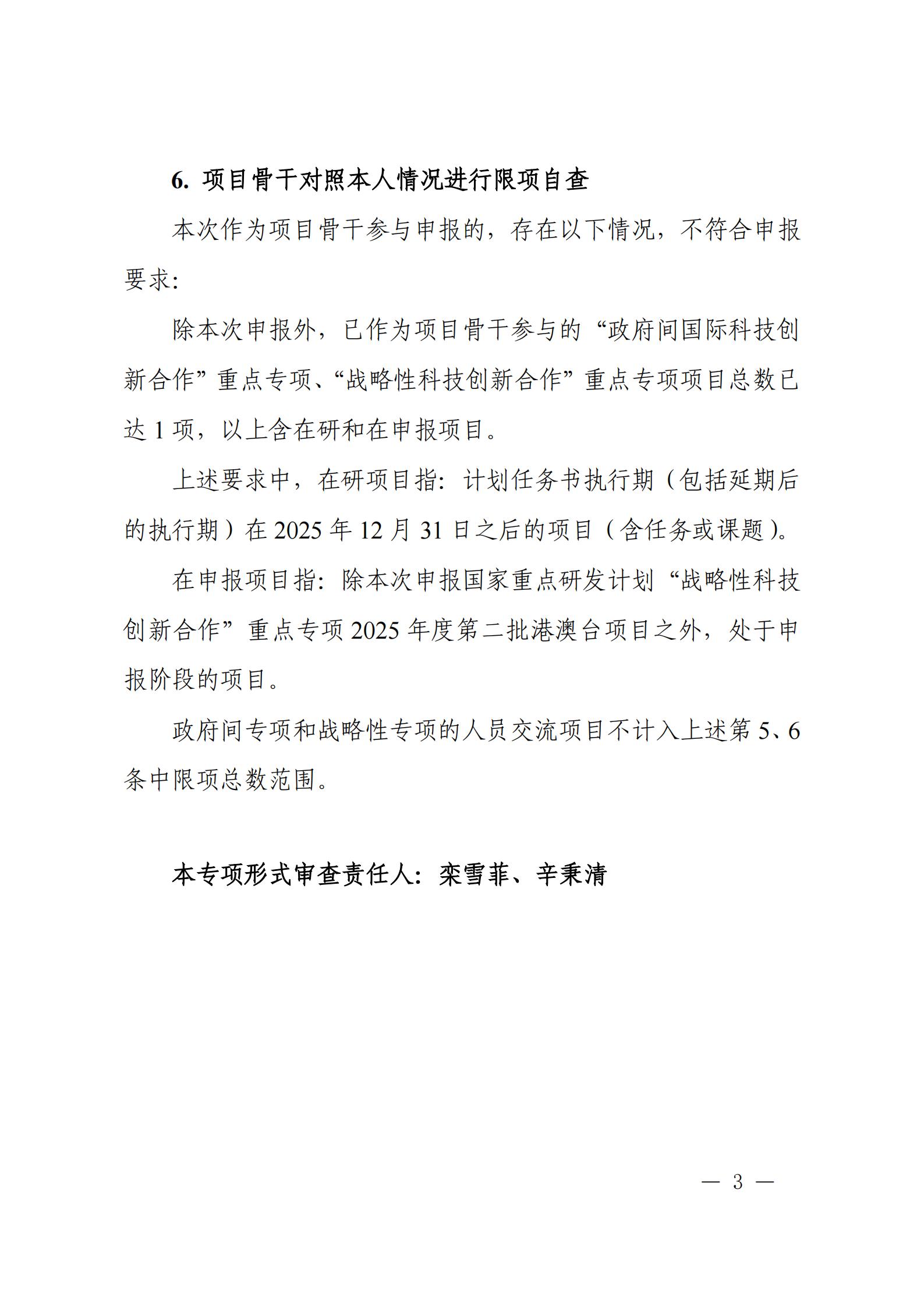 對于中央財政專項資金預算不超過400萬元的“政府間國際科技創新合作”重點專項(簡稱政府間專項)和“戰略性科技創新合作”重點專項(簡稱戰略性專項)項目,與國家重點研發計劃其他專項項目互不開展限項審查,與國家科技重大專項(含科技創新2030—重大項目)項目不開展限項審查;項目負責人的申報和在研的政府間專項和戰略性專項項目的總數限為1項(含不超過400萬元的項目);同時,項目骨干的申報和在研的政府間專項和戰略性專項項目的總數限為1項(含不超過400萬元的項目)。政府間專項和戰略性專項的人員交流項目不計入上述限項總數范圍。項目申報人可對照形式審查條件要求(附件2)進行限項自查。