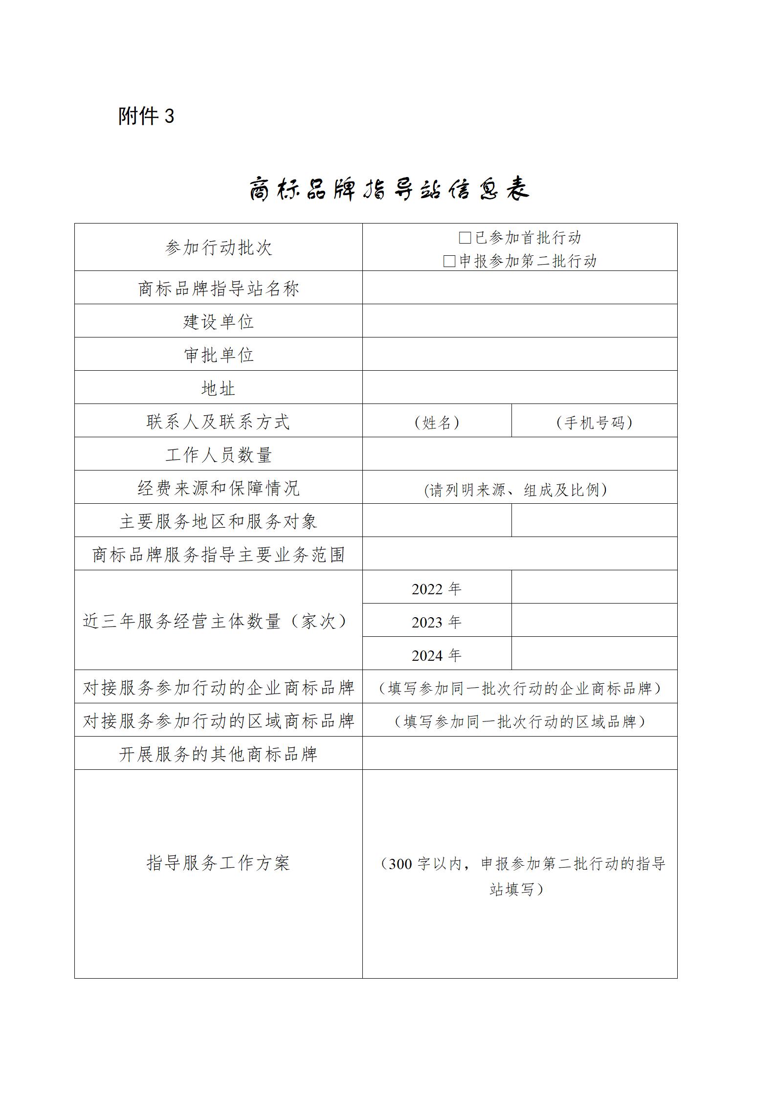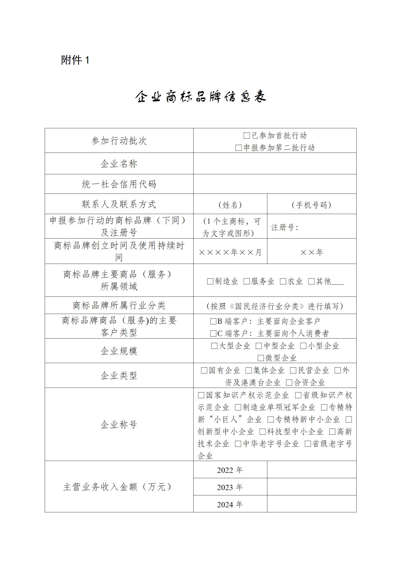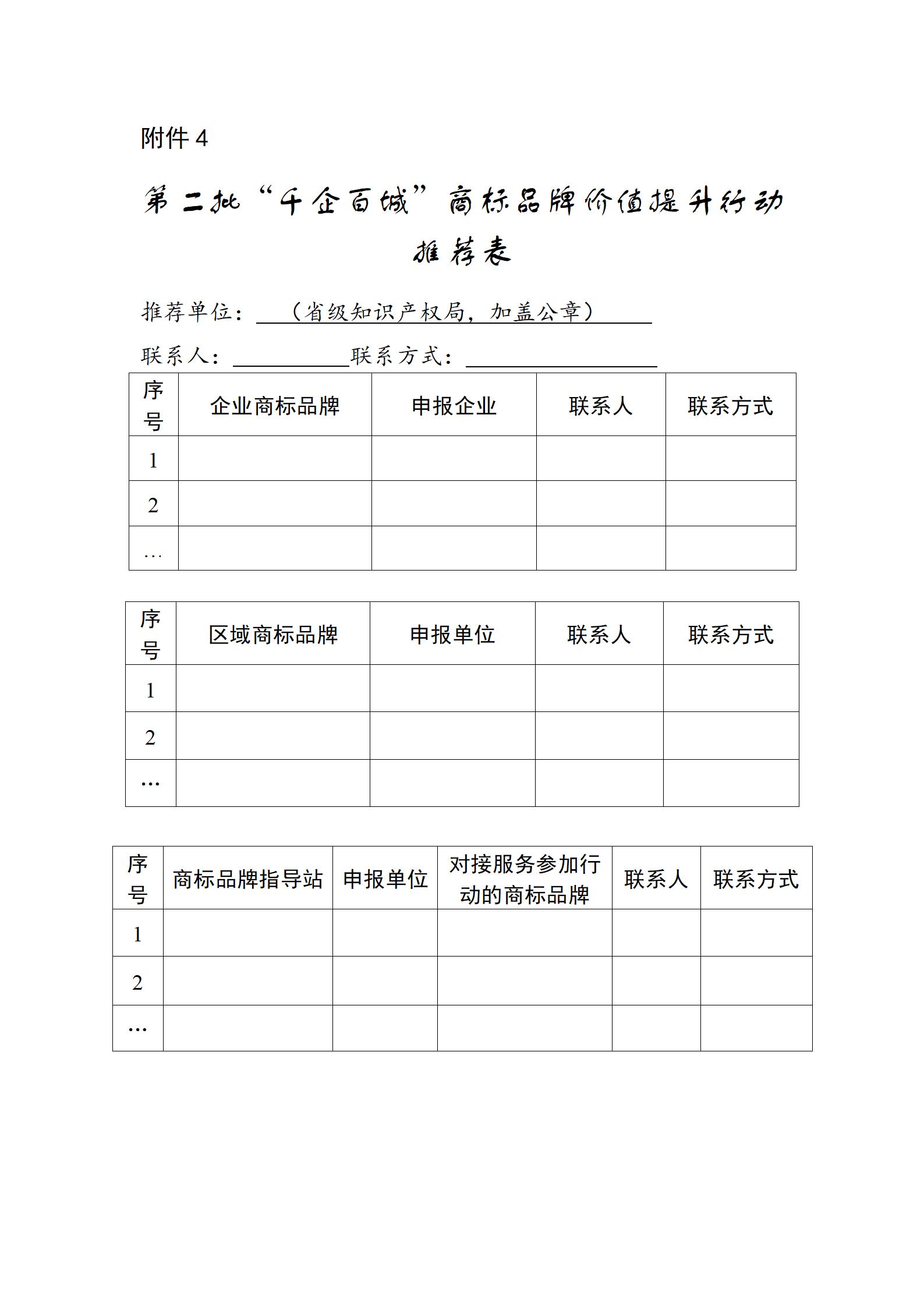 (一)情況報送。各省級知識產權局根據《國家知識產權局辦公室關于公布首批參加“千企百城”商標品牌價值提升行動名單的通知》(國知辦函運字〔2023〕1106號)公布的名單,組織首批參加行動的企業、區域商標品牌主體和商標品牌指導站,填寫年度建設情況(附件1—3)。