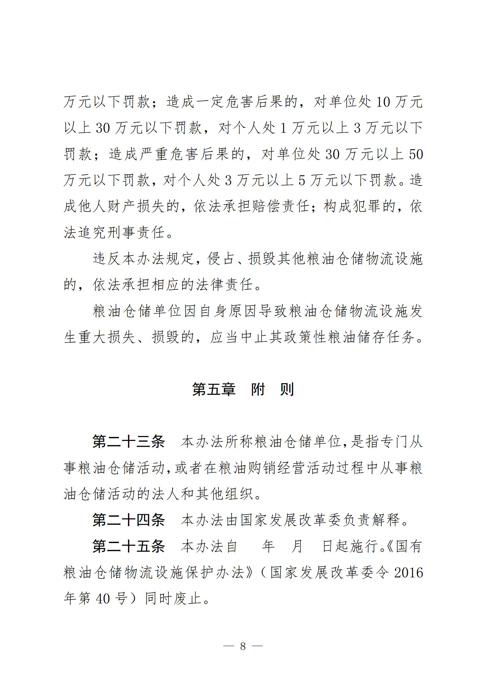 為認真貫徹落實《中華人民共和國糧食安全保障法》,加強糧油倉儲物流設(shè)施保護,保障國家糧食安全,我們組織修訂《國有糧油倉儲物流設(shè)施保護辦法》(國家發(fā)展改革委令2016年第40號),形成了《糧油倉儲物流設(shè)施保護辦法(公開征求意見稿)》,現(xiàn)向社會公開征求意見。