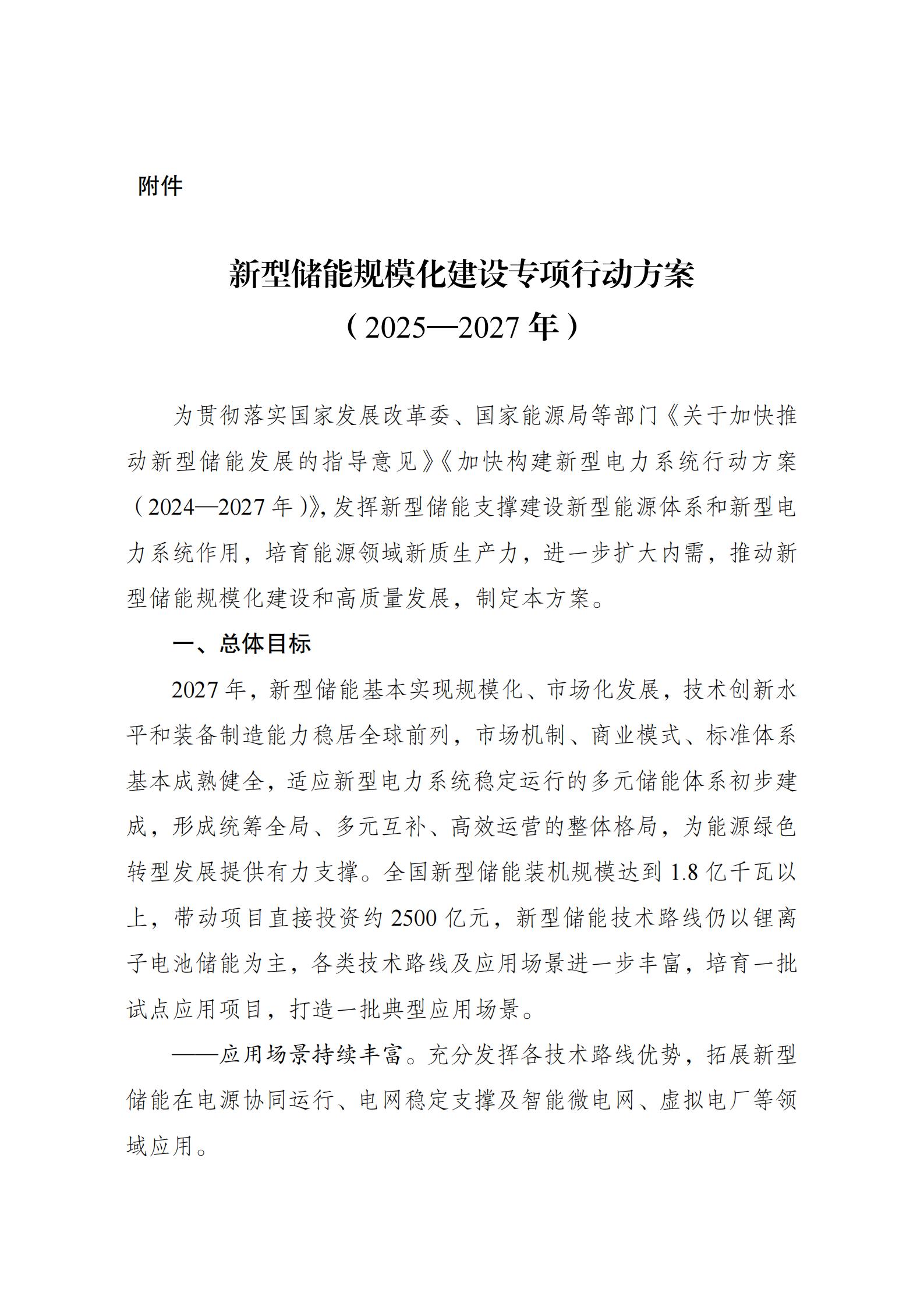 ??為推動新型儲能高質量發展,國家發展改革委、國家能源局研究制定了《新型儲能規模化建設專項行動方案(2025—2027年)》。現予印發,請結合實際認真抓好貫徹落實。