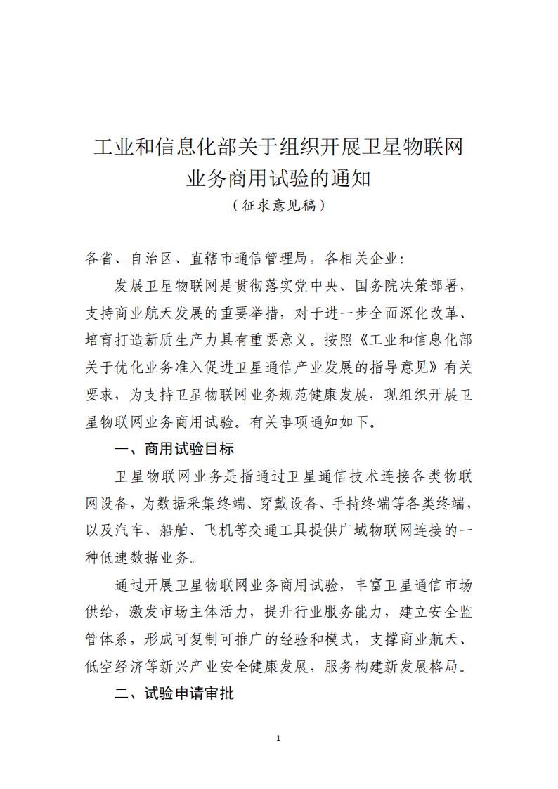 公開征求對《工業和信息化部關于組織開展衛星物聯網業務商用試驗的通知(征求意見稿)》的意見