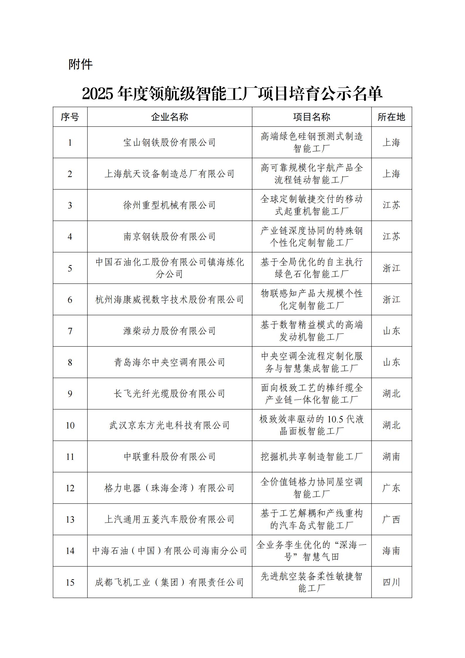 關(guān)于2025年度領(lǐng)航級智能工廠項(xiàng)目培育名單的公示