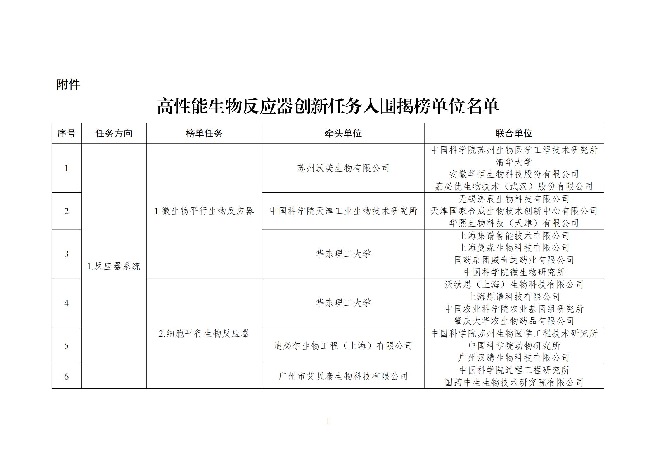 附件:高性能生物反應器創新任務入圍揭榜單位名單