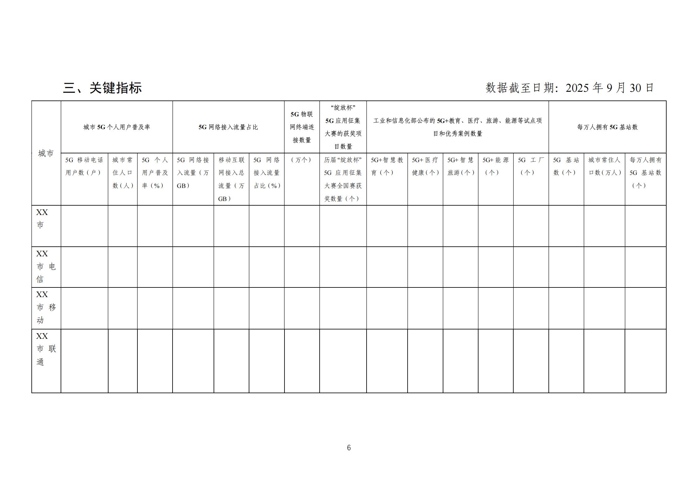 (二)評(píng)估報(bào)送階段(2025年12月)。各地通信管理局會(huì)同工業(yè)和信息化主管部門(mén),結(jié)合本區(qū)域?qū)嶋H情況,總結(jié)評(píng)估5G應(yīng)用“揚(yáng)帆”行動(dòng)重點(diǎn)城市5G發(fā)展及應(yīng)用情況,切實(shí)做好關(guān)鍵指標(biāo)數(shù)據(jù)核實(shí),于2025年12月30日前在5G應(yīng)用“揚(yáng)帆”行動(dòng)發(fā)展監(jiān)測(cè)平臺(tái)(https://5gyfcs.cn:56101)填報(bào)發(fā)展情況報(bào)告(見(jiàn)附件2),并將紙質(zhì)版材料報(bào)送工業(yè)和信息化部(信息通信發(fā)展司)。