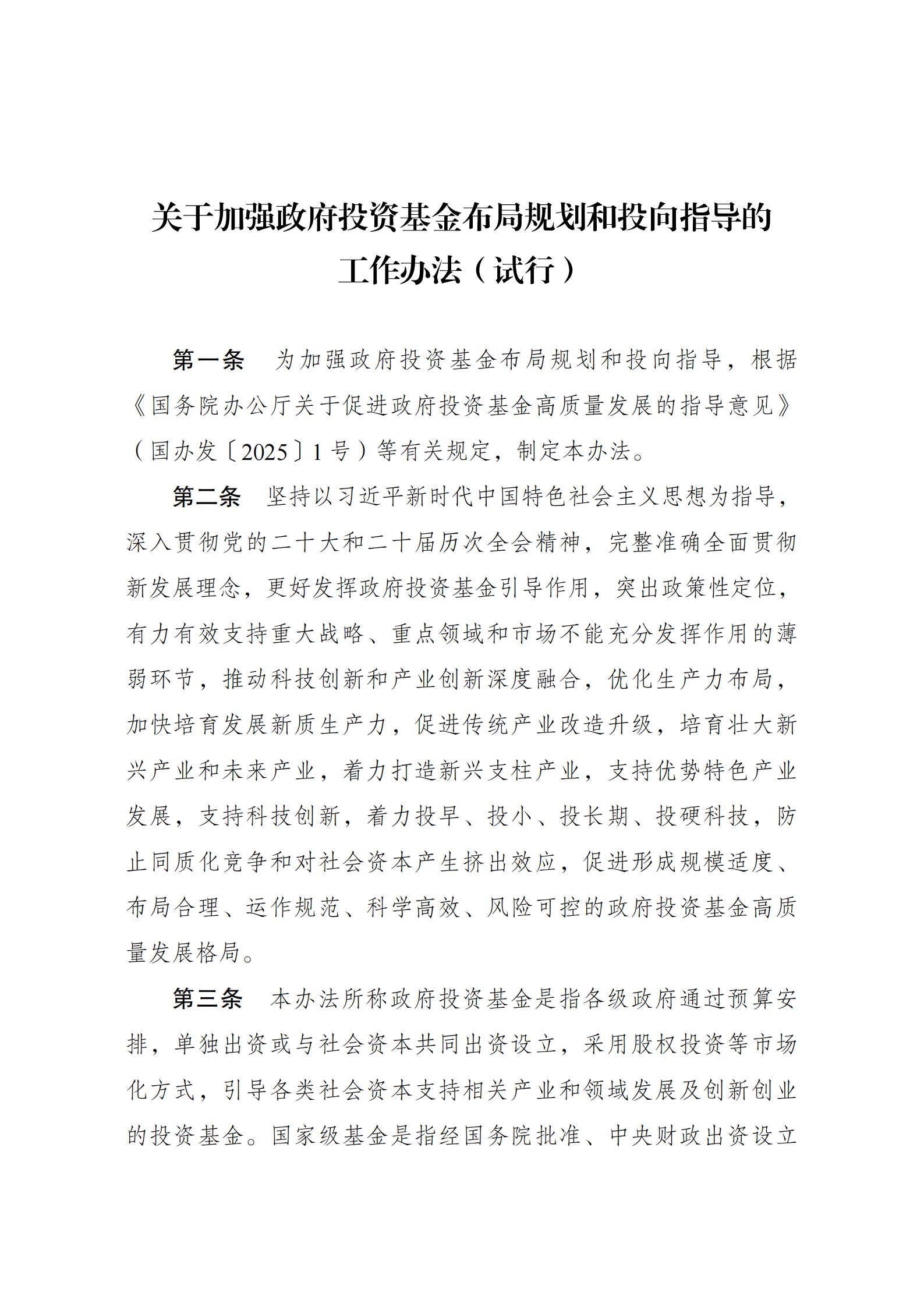 關(guān)于印發(fā)《關(guān)于加強(qiáng)政府投資基金布局規(guī)劃和投向指導(dǎo)的工作辦法(試行)》的通知(發(fā)改財(cái)金規(guī)〔2025〕1752號(hào))