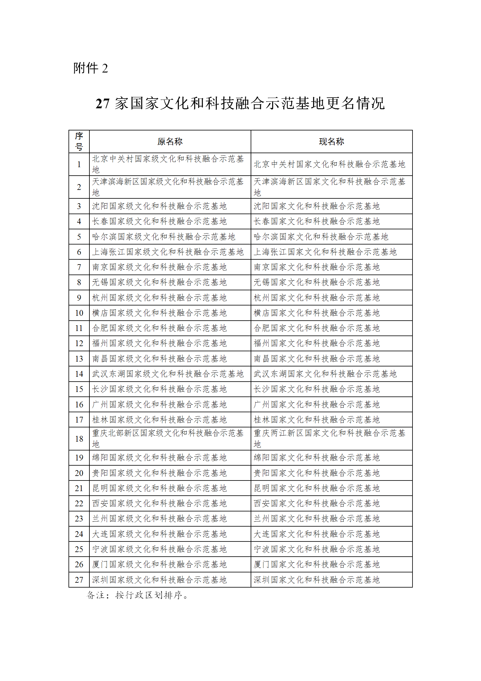 按照《管理辦法》相關規定,對前兩批34家集聚類基地中評價結果為優秀或合格的基地統一進行更名,將“XX國家級文化和科技融合示范基地”更名為“XX國家文化和科技融合示范基地”(共27家,具體命名情況詳見附件2)。