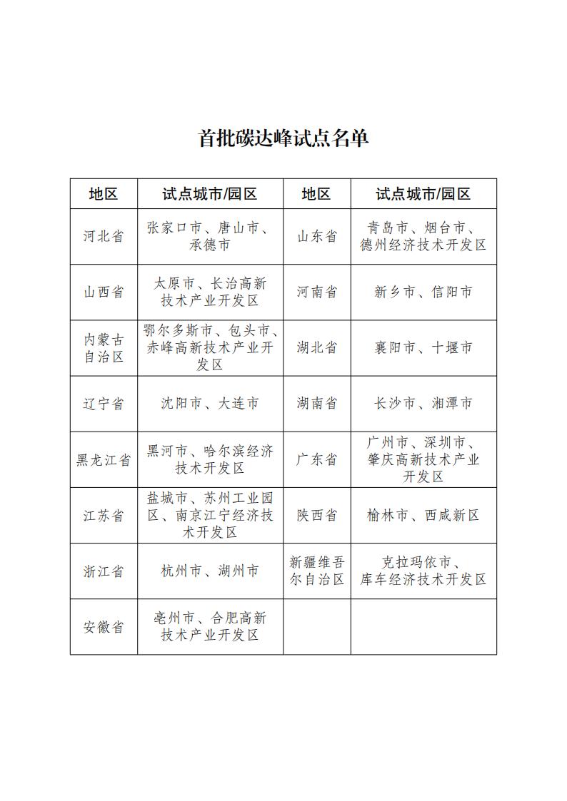 ??為落實國務院《2030年前碳達峰行動方案》(國發〔2021〕23號)有關部署,按照《國家碳達峰試點建設方案》(發改環資〔2023〕1409號)工作安排,經有關地區城市和園區自愿申報、省級發展改革委推薦、省級人民政府審核、國家發展改革委復核,確定張家口市等25個城市、長治高新技術產業開發區等10個園區為首批碳達峰試點城市和園區,現予公布,并就有關事項通知如下: