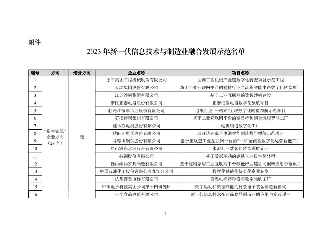 ? ? ?根據《工業和信息化部辦公廳關于組織開展2023年新一代信息技術與制造業融合發展示范申報工作的通知》(工信廳信發函〔2023〕243號),經企業自主申報、地方推薦、專家評審等環節,形成了2023年新一代信息技術與制造業融合發展示范名單。