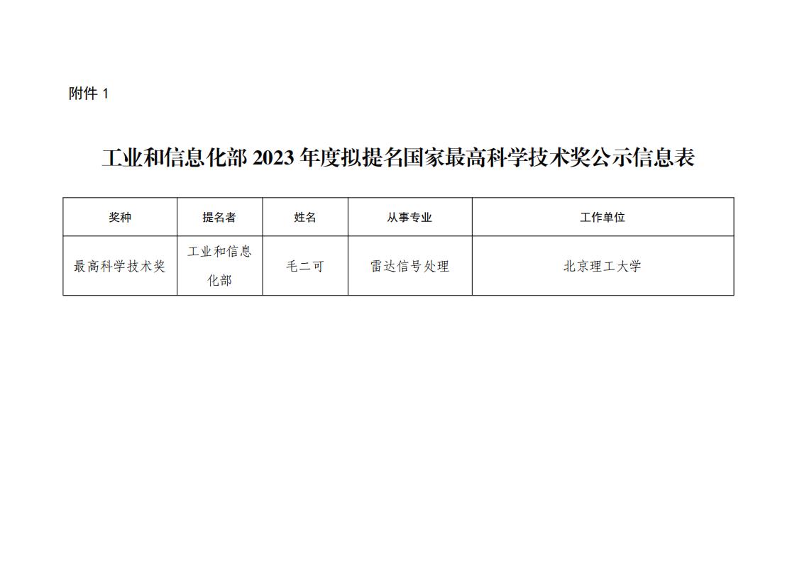 附件:1.工業和信息化部2023年度擬提名國家最高科學技術獎公示信息表
