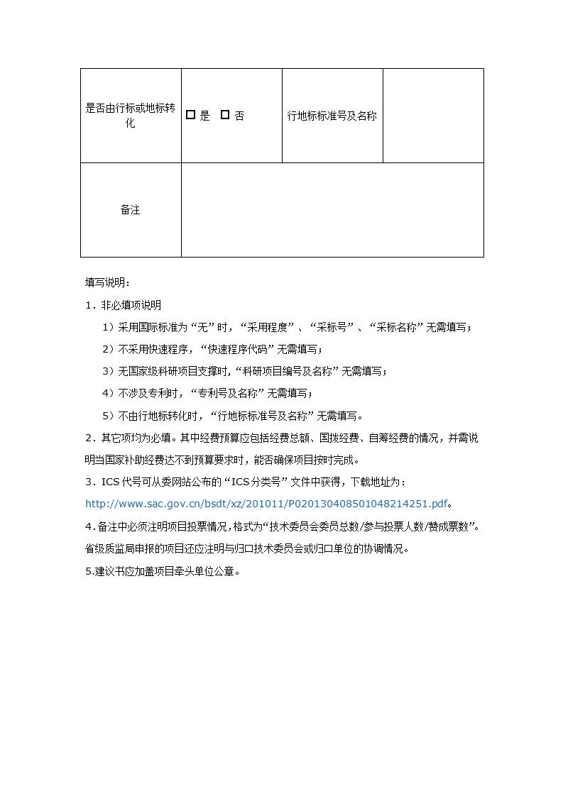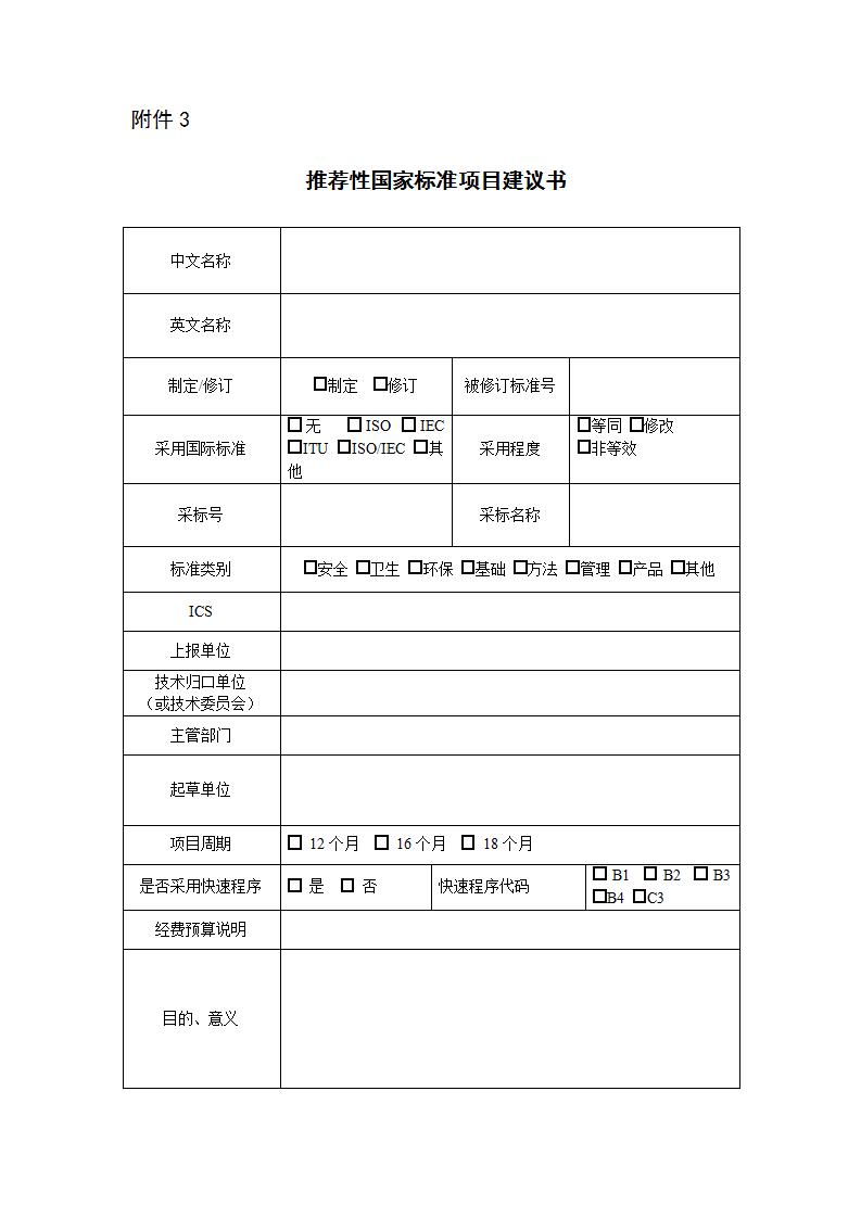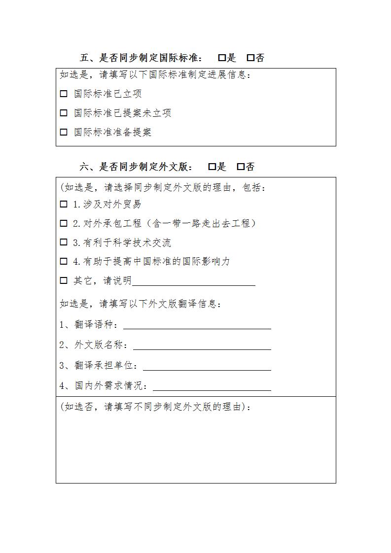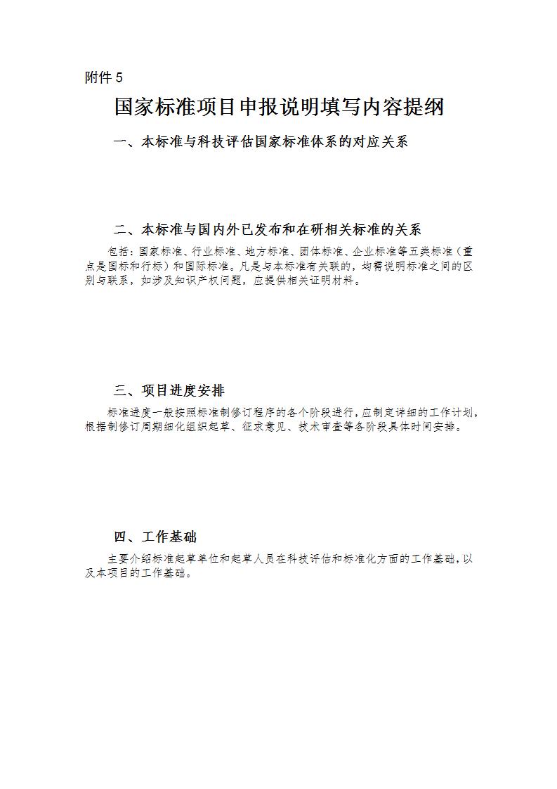 3.項目申報說明(內容提綱見附件5)。應加蓋項目牽頭單位公章,并明確標準與科技評估國家標準體系的對應關系、標準與國內外已發布和在研相關標準的關系、相關工作基礎、是否同步制定國際標準或國家標準外文版、對標準實施的有關考慮、知識產權承諾等。