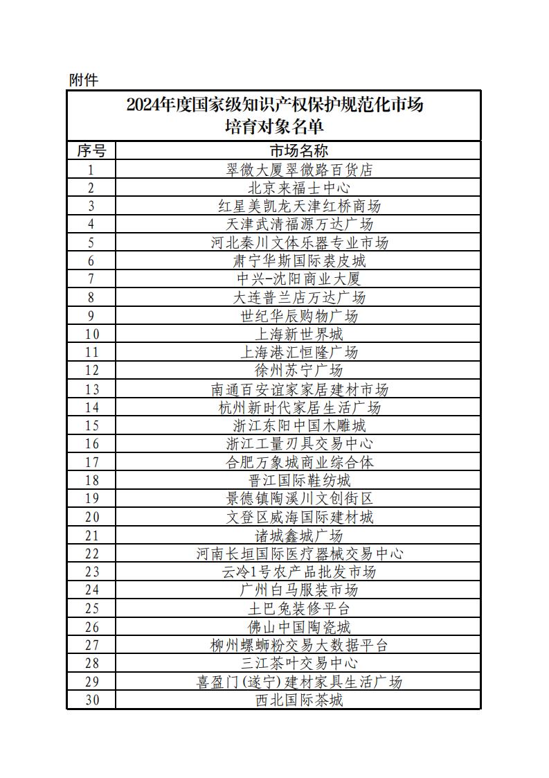 國家知識產權局|關于公布2024年度國家級知識產權保護規范化市場培育對象的通知