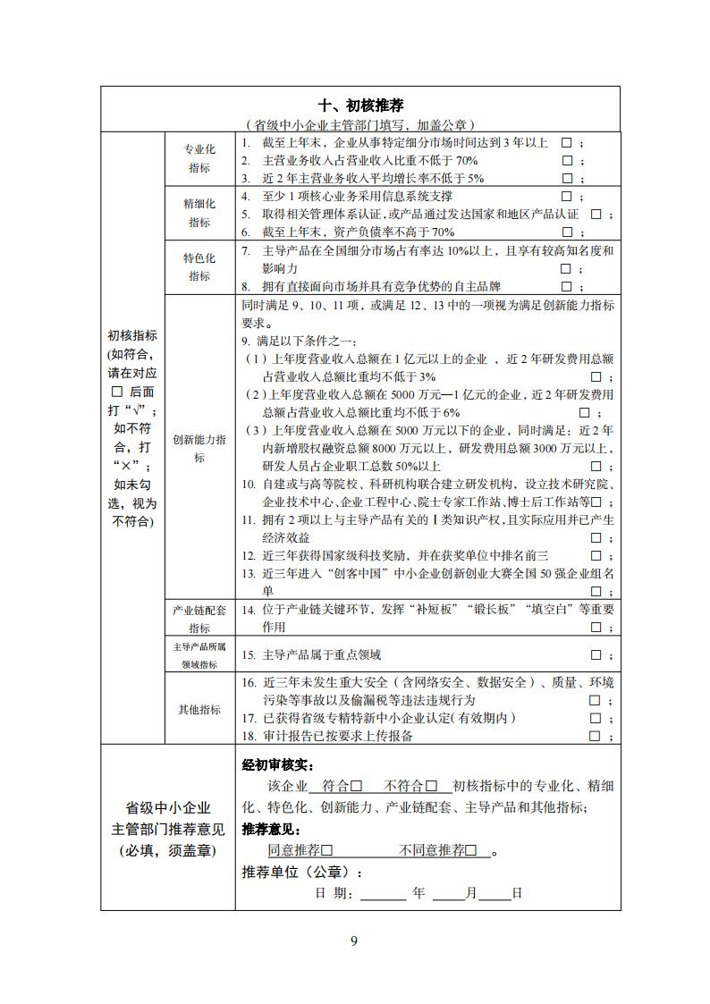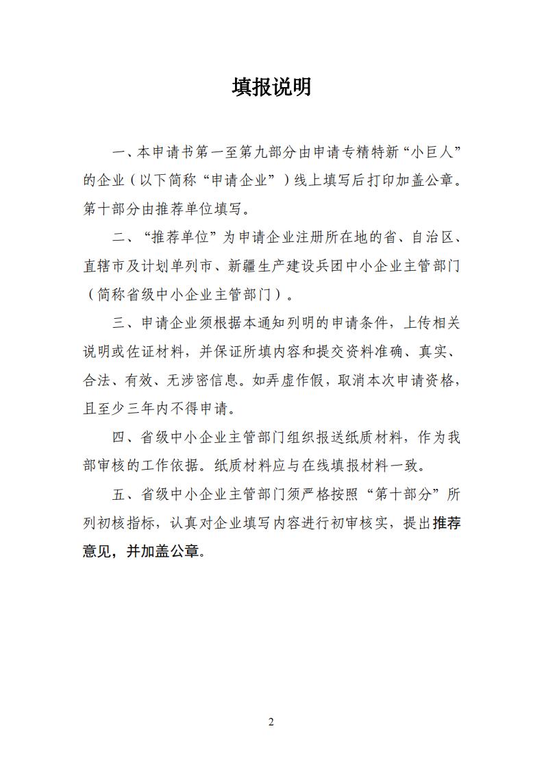 (二)要擇優(yōu)組織符合條件的企業(yè)填寫“第六批專精特新‘小巨人’企業(yè)申請書”(附件1)或“第三批專精特新‘小巨人’企業(yè)復(fù)核申請書(附件2),并結(jié)合工作實際提出佐證材料要求,初審核實后提出推薦意見。