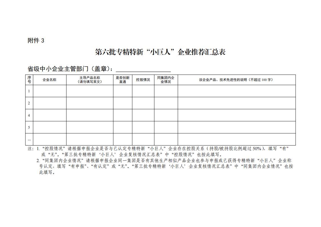 (四)對于已成為工業(yè)和信息化部制造業(yè)單項冠軍示范企業(yè)或單項冠軍產(chǎn)品的企業(yè),不再推薦新申請第六批專精特新“小巨人”企業(yè);對于與我部已認定的專精特新“小巨人”企業(yè)存在控股關(guān)系的企業(yè),以及同一集團內(nèi)生產(chǎn)相似主導(dǎo)產(chǎn)品企業(yè),不予推薦;對于第三批專精特新“小巨人”企業(yè),不推薦復(fù)核的,需說明原因。