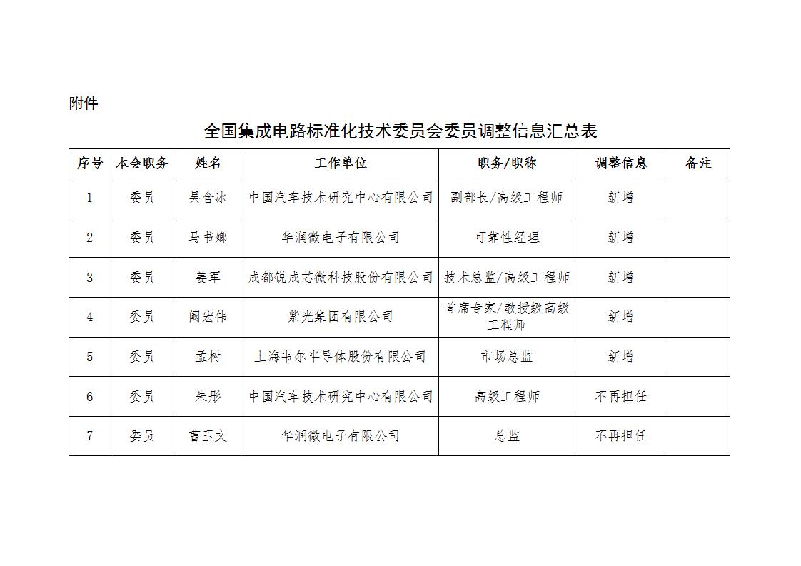 全國集成電路標準化技術委員會委員調整公示