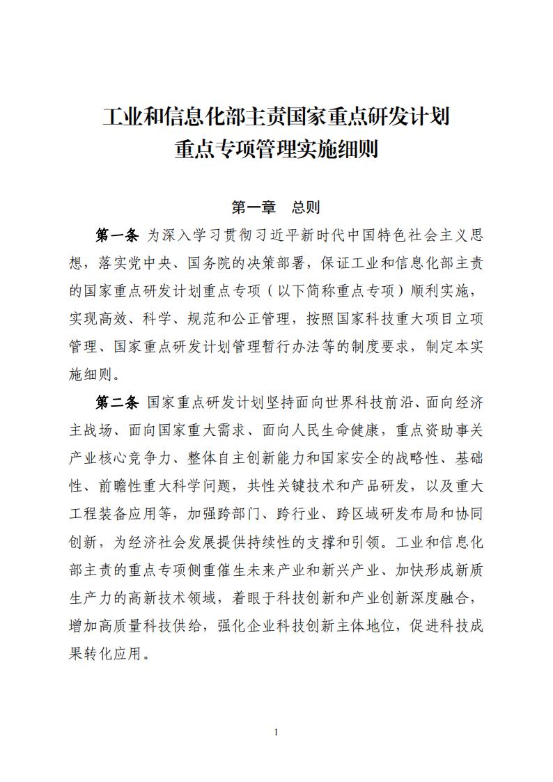 為規范工業和信息化部主責國家重點研發計劃重點專項管理,保障專項組織實施,根據黨中央、國務院關于科技計劃管理改革的有關要求,按照科技部、財政部《國家重點研發計劃管理暫行辦法》(國科發資〔2024〕28號),現將《工業和信息化部主責國家重點研發計劃重點專項管理實施細則》印發給你們,請遵照執行。