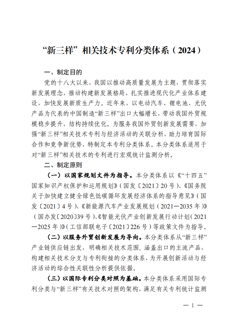 國家知識產(chǎn)權(quán)局關(guān)于印發(fā)《“新三樣”相關(guān)技術(shù)專利分類體系(2024)》的通知