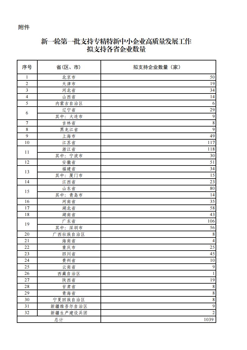 關(guān)于新一輪第一批支持專精特新中小企業(yè)高質(zhì)量發(fā)展工作擬支持各省企業(yè)數(shù)量的公示