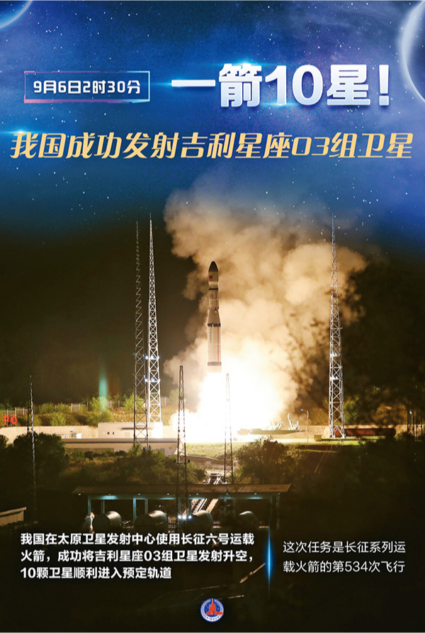 圖為2024年9月6日2時30分,我國在太原衛星發射中心使用長征六號運載火箭,成功將吉利星座03組衛星發射升空,10顆衛星順利進入預定軌道,發射任務獲得圓滿成功。 新華社發 施鰻珂 安迪/編制