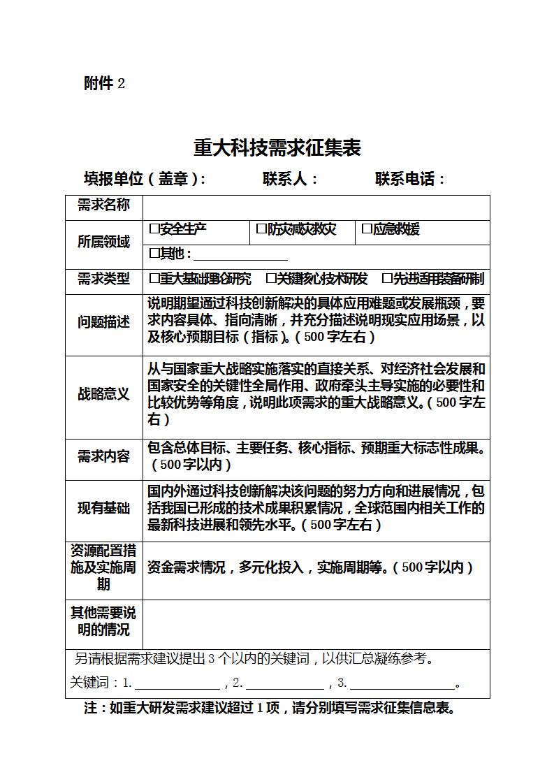 2.鼓勵各單位將需求征集作為科技支撐應急管理工作的重要內容,建立常態化的難題收集、需求凝練、專家論證機制,形成本領域研發需求庫,在此基礎上動態更新并擇優推薦。