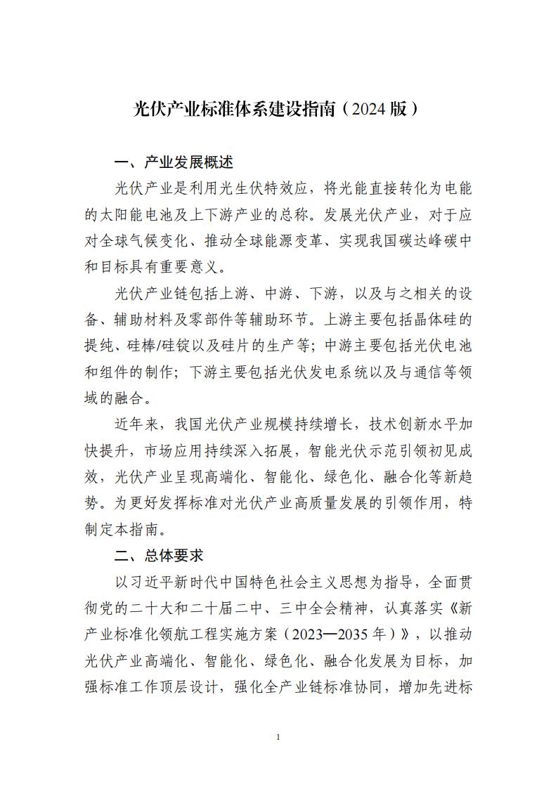 為認真落實《新產業標準化領航工程實施方案(2023—2035年)》,加強光伏產業標準工作頂層設計,我們組織編制了《光伏產業標準體系建設指南(2024版)》。現印發給你們,請結合實際,抓好貫徹落實。