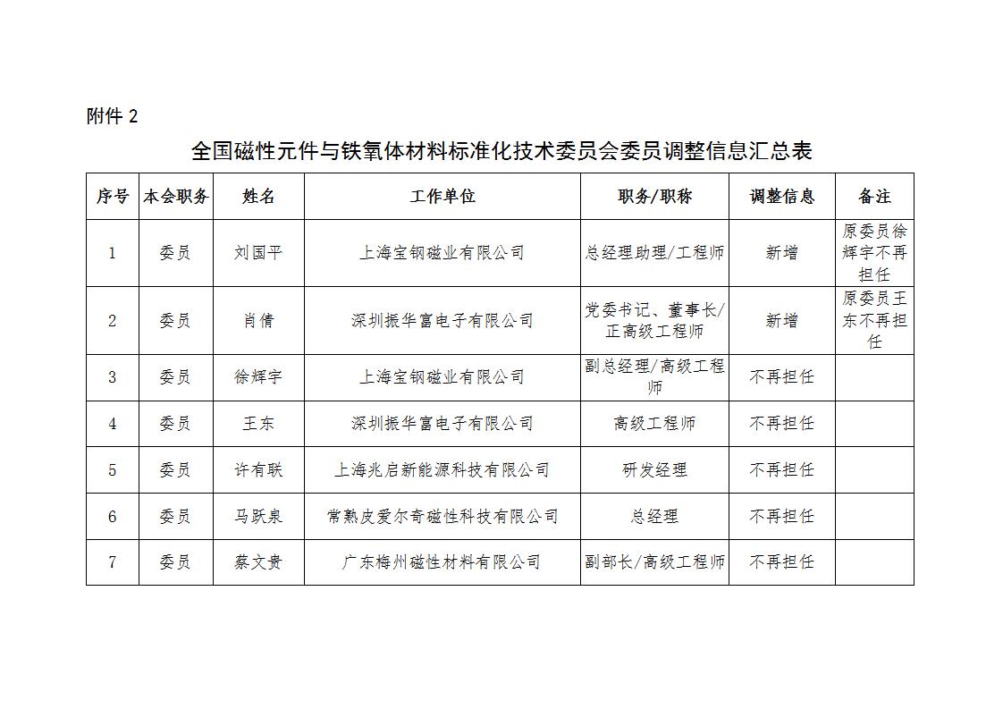 2.全國磁性元件與鐵氧體材料標準化技術委員會委員調整信息匯總表