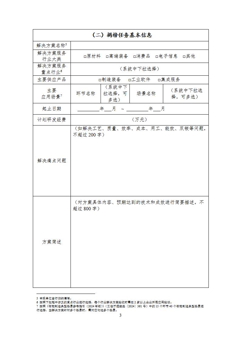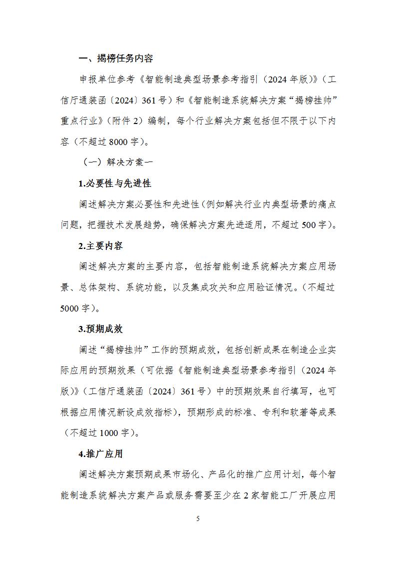 (二)每個申報單位可牽頭申報1個項目,最多可涵蓋3個智能制造系統解決方案揭榜任務。揭榜任務應聚焦某一具體行業(附件2)、圍繞智能制造典型場景(詳見《智能制造典型場景參考指引(2024年版)》)開展集成攻關和應用驗證。