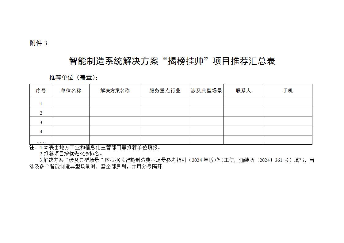 (四)推薦單位應于2024年11月20日前完成線上審核,按推薦項目優先順序填寫推薦匯總表(附件3),并將加蓋推薦單位公章的紙質版申報書、推薦匯總表各1份報送工業和信息化部(裝備工業一司)。