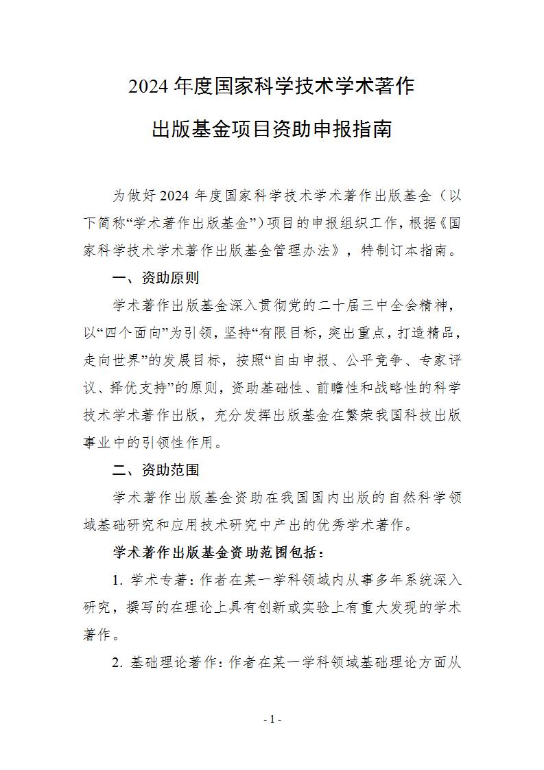 ? ? ? ? 為繁榮科技出版事業,促進科技創新,推動國家創新驅動發展戰略實施,根據國家科學技術學術著作出版基金(以下簡稱“學術著作出版基金”)工作安排,現發布2024年度學術著作出版基金項目資助申請指南(見附件)。