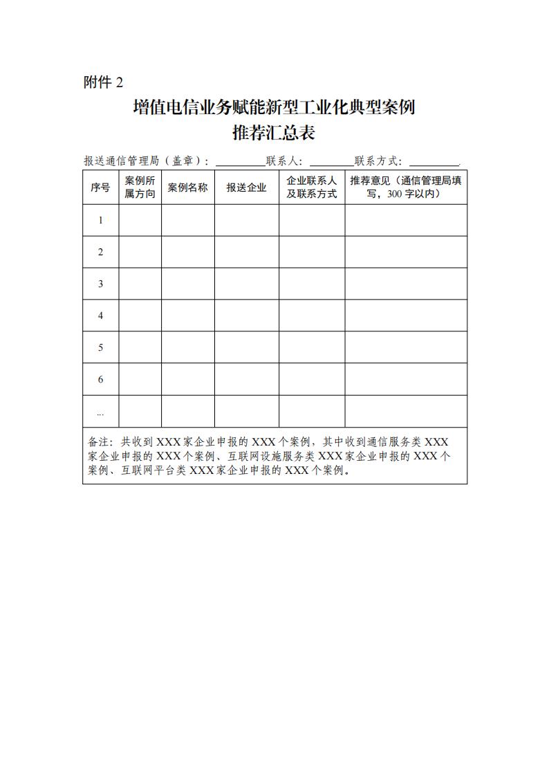 (四)各省管局按照上述要求嚴格把關、擇優推薦,填寫“增值電信業務賦能新型工業化典型案例匯總表”(詳見附件2)。推薦表和推薦案例請于2025年2月28日前報送至工業和信息化部(信息通信管理局),電子版發送至xuhuiju@caict.ac.cn。