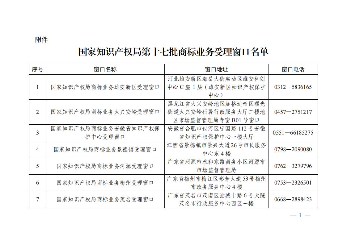 國家知識產(chǎn)權(quán)局|關(guān)于公布第十七批商標(biāo)業(yè)務(wù)受理窗口的公告