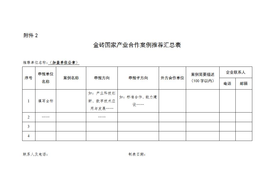 (二)推薦單位負責組織填寫《金磚國家產業合作案例申報書》(附件1,如有圖表、圖片、視頻等有助于更好宣介案例的資料可一并提供)、《金磚國家產業合作案例推薦匯總表》(附件2),審核后于2025年4月25日前報送工業和信息化部(國際合作司),電子版發送至dic@cietc.org.cn。