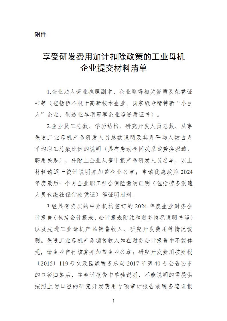 四部門關于2024年度享受研發費用加計扣除政策的工業母機企業清單制定工作有關事項的通知
