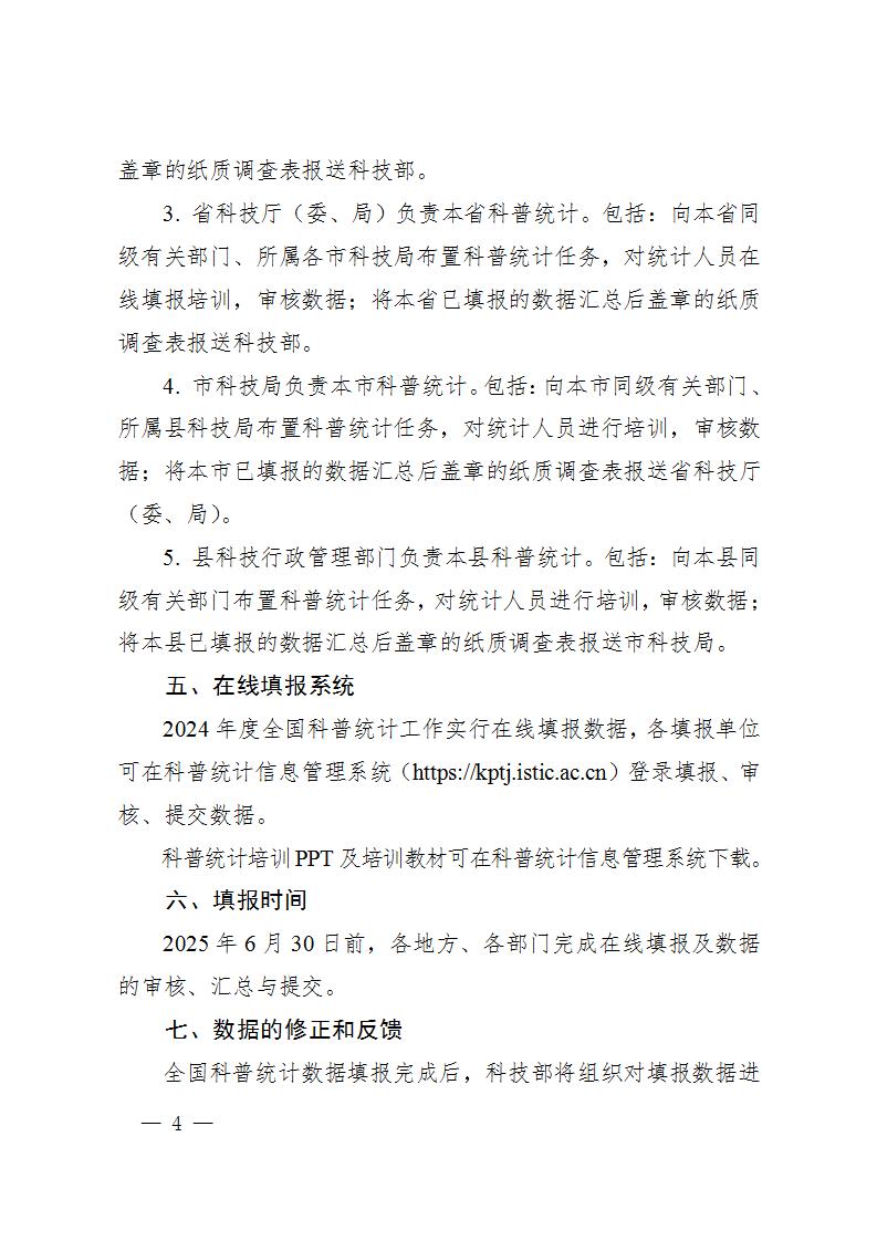 2. 請各地方、各部門于2025年6月30日前完成有關科普統計數據在線提交,將數據匯總后填寫《2024年度科普統計調查表》(附件2)并將調查表逐頁蓋章后報送科技部九司。