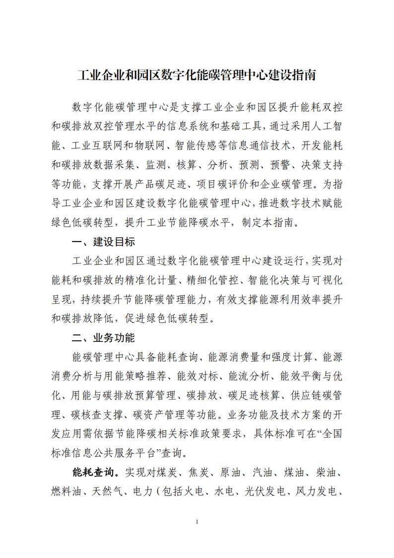 ? ? ?為加強工業(yè)節(jié)能降碳管理,支撐構建系統(tǒng)完備的碳排放雙控制度體系,工業(yè)和信息化部組織編制了《工業(yè)企業(yè)和園區(qū)數(shù)字化能碳管理中心建設指南》,現(xiàn)印發(fā)給你們。請結合實際組織實施,強化宣傳解讀,因地制宜指導工業(yè)企業(yè)、工業(yè)園區(qū)開展數(shù)字化能碳管理中心建設運行,提升碳管理水平,加快綠色低碳轉型。