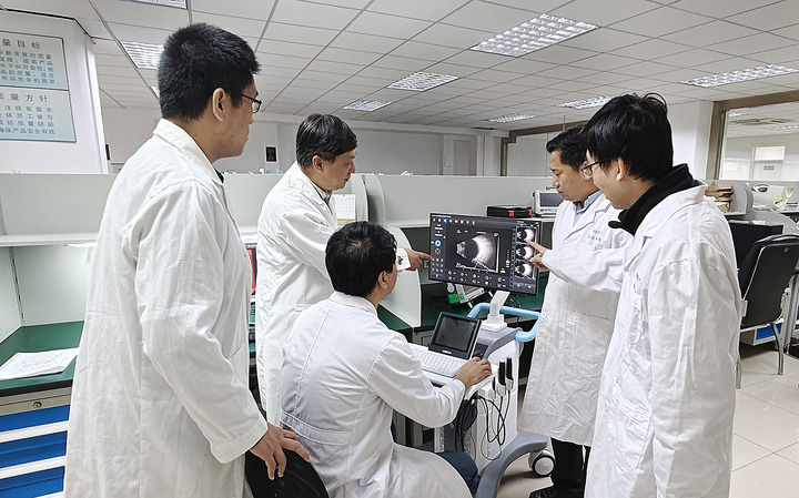 ??中國醫學科學院生物醫學工程研究所眼科診療技術研發團隊負責人楊軍(左二)在天津和團隊一起交流(2023年11月2日攝)。新華社發