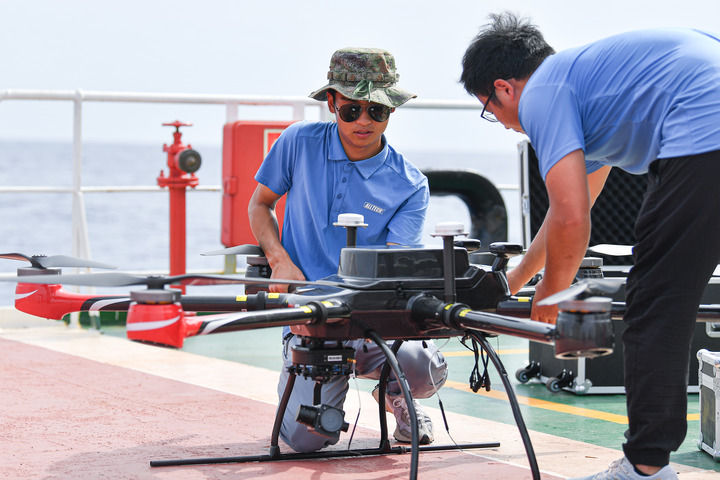 ??工作人員在“電科1號”綜合試驗船上調試無人機(2023年6月15日攝)。新華社記者 蒲曉旭 攝
